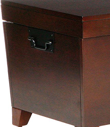 What a combination of contemporary style and usefulness! This espresso trunk will not only help you organize your living room by giving you extra storage, but also look great. Black metal handles complete the universal style of this cocktail table trunk.This mission inspired piece also includes safety hinges to prevent slamming. Dimensions include: Overall: 38.75" W x 21.25" D x 18.75" H; Tabletop: 37.5" W x 20.25" D; Interior storage: 34.25" W x 17" D x 11.5" H (plus 2.25" H in lid); Clearance: 31" W x 13.5" D x 2.75" H. This one-of-a-kind item approximately weighs 61 pounds and can support up to 80 pounds (top), 100 pounds (interior storage). Only quality materials and manufacturing will do. Product materials include: pine, MDF, pine veneer, metal. Assembly required. Made in China.Organize and store items in style with this espresso trunk that doubles as a cocktail table