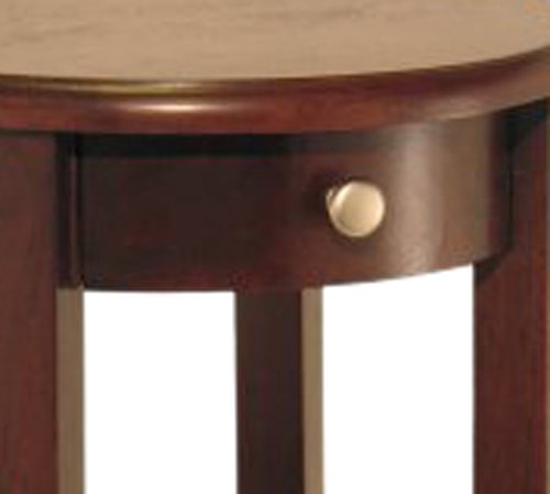 Beautiful walnut finish round end table. Drawer has satin nickel knob, shelf for storing décor.With the tapered legs, this end table is elegant.Match with round side table # 94220 collection.Round End Table sits on sturdy legs and feature a small drawer plus shelf.